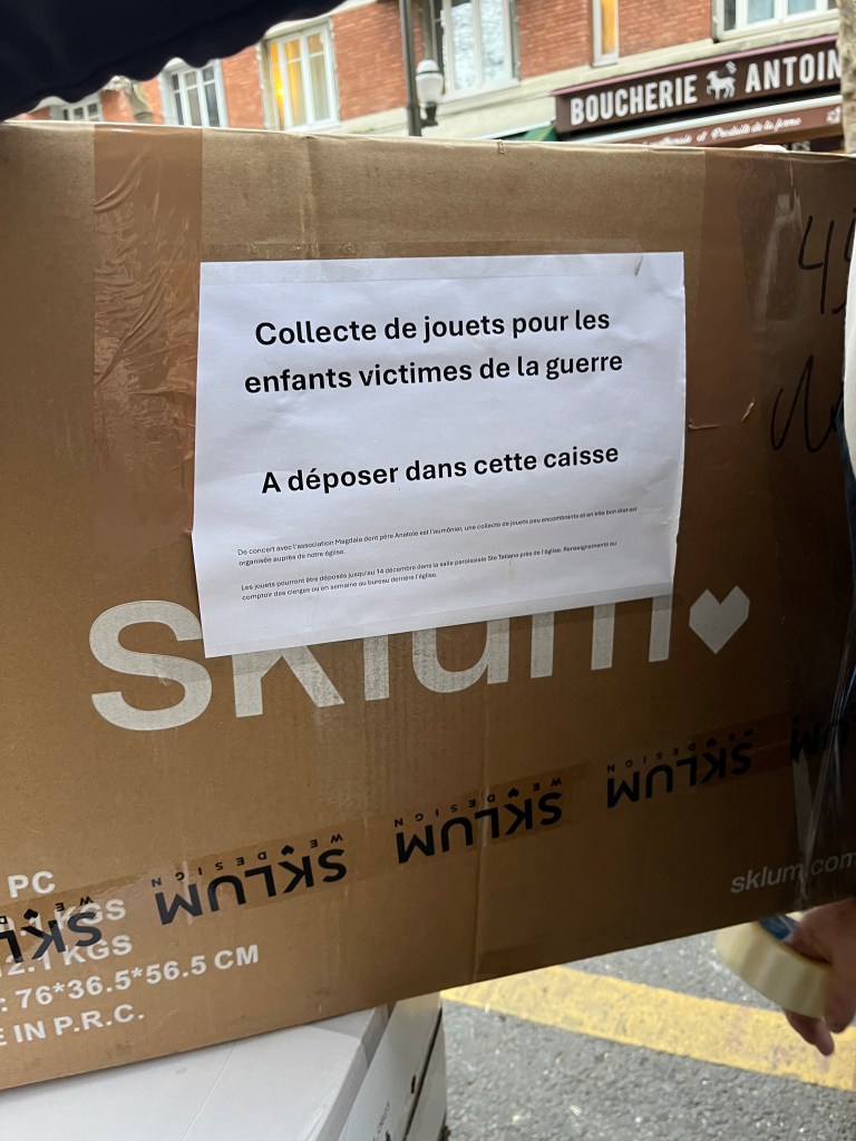 POUR CETTE COLLECTE, NOUS SOUHAITONS ENVOYER DES JOUETS, DES BONBONS, DU CAFE POUR LES SOLDATS QUI ONT FROID, ET TOUT CE QUE NOUS ENVOYONS D’HABITUDE. TOUT CE QUI POURRAIT FORMER UN GESTE FRATERNEL ENVERS LES PERSONNES AGEES QUI N’ONT PAS PU PARTIR ET ACHEVERAIENT LEUR EXISTENCE SOUS LES BOMBES ET TOUTES LES PERSONNES VICTIME DE GUERRE.