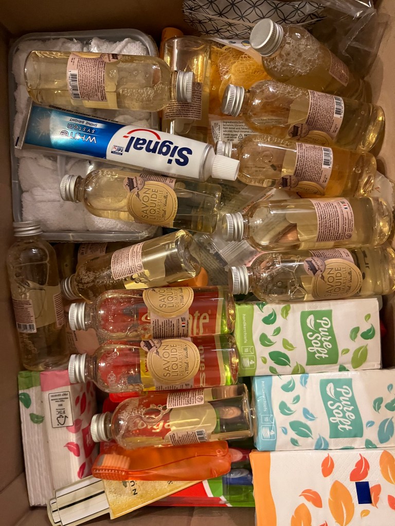 -brosses à dents, dentifrice, shampoing, savons, serviettes hygiéniques.