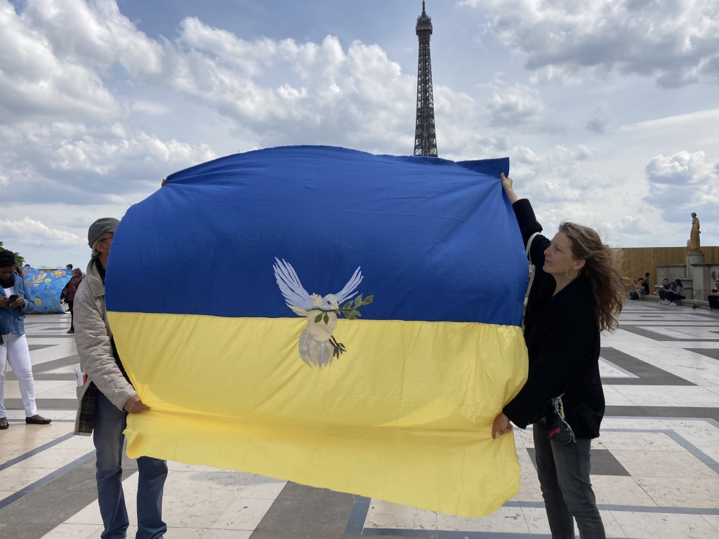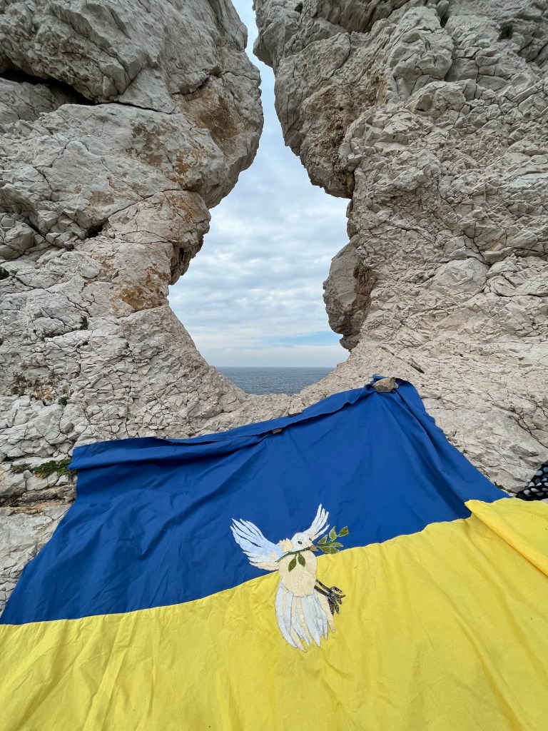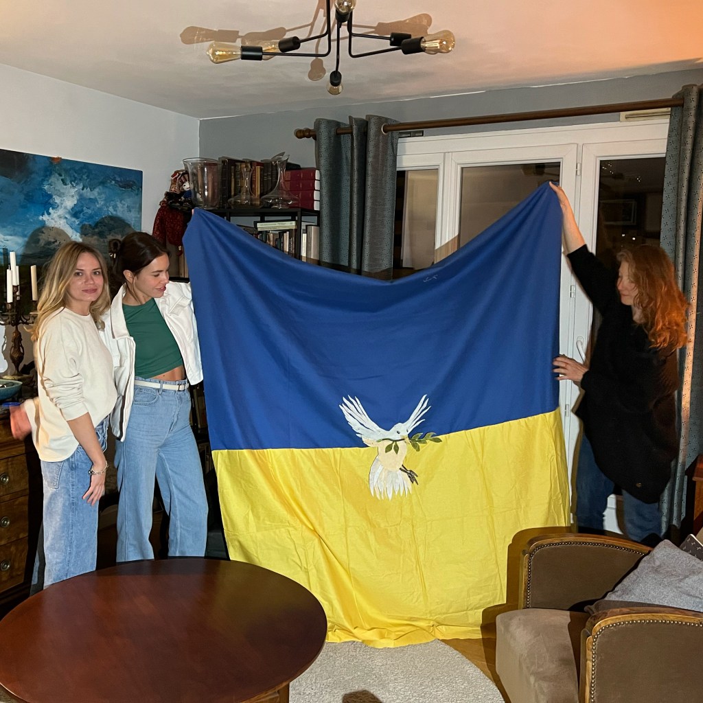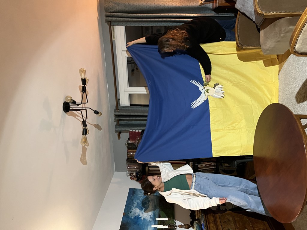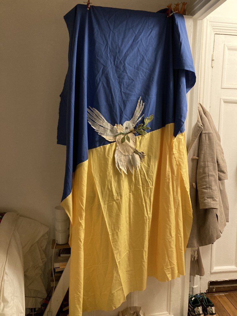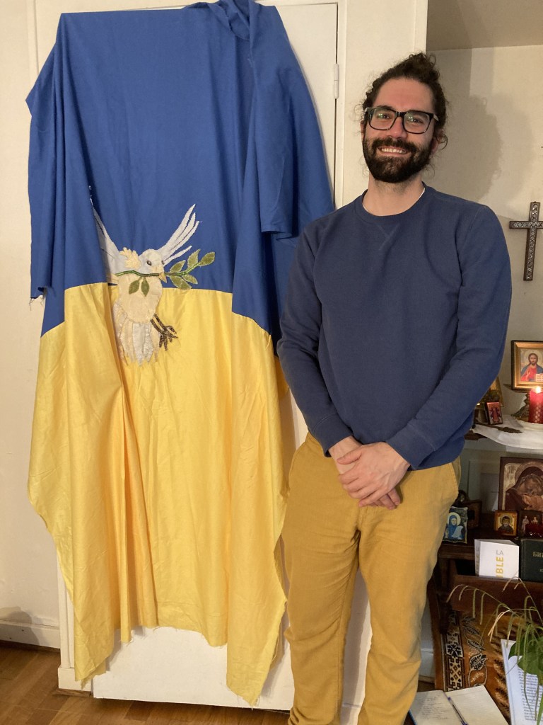 Ce drapeau a été cousu parfois avec les réfugiées accueillies par Magdala depuis mars 2022 et incarne l’espoir d’un arrêt de l’agression militaire russe en Ukraine, le retour de la paix sur le sol ukrainien et le droit, la liberté des peuples à décider de leur destin.