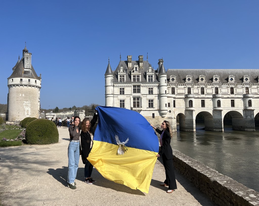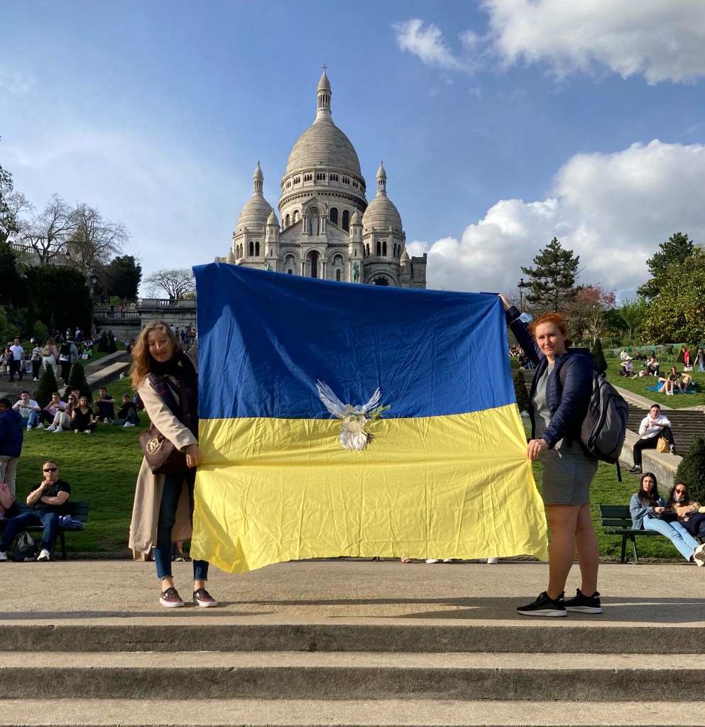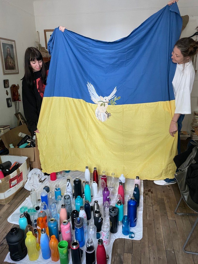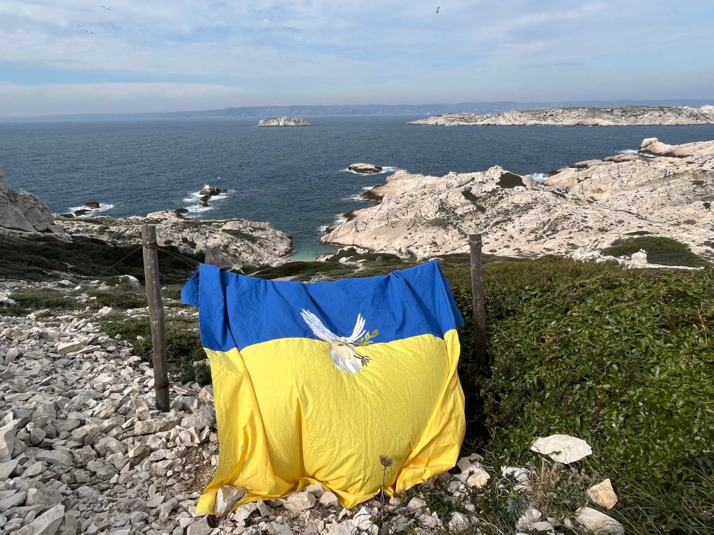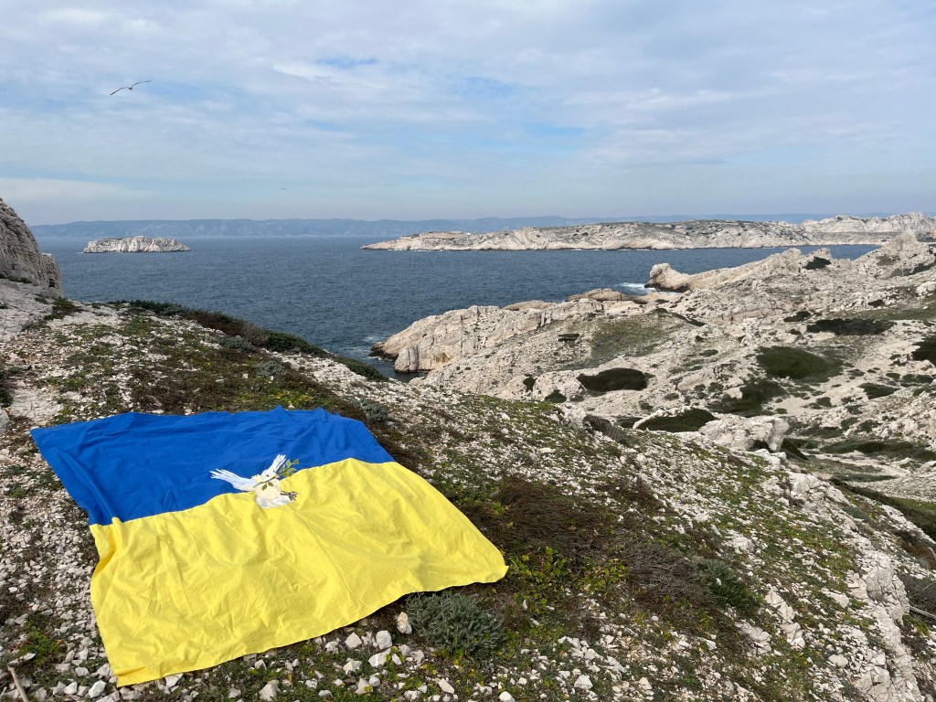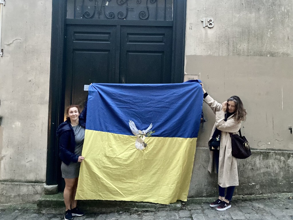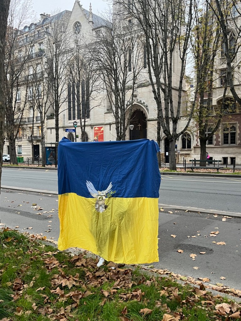 Ce drapeau a été cousu parfois avec les réfugiées accueillies par Magdala depuis mars 2022 et incarne l’espoir d’un arrêt de l’agression militaire russe en Ukraine, le retour de la paix sur le sol ukrainien et le droit, la liberté des peuples à décider de leur destin.