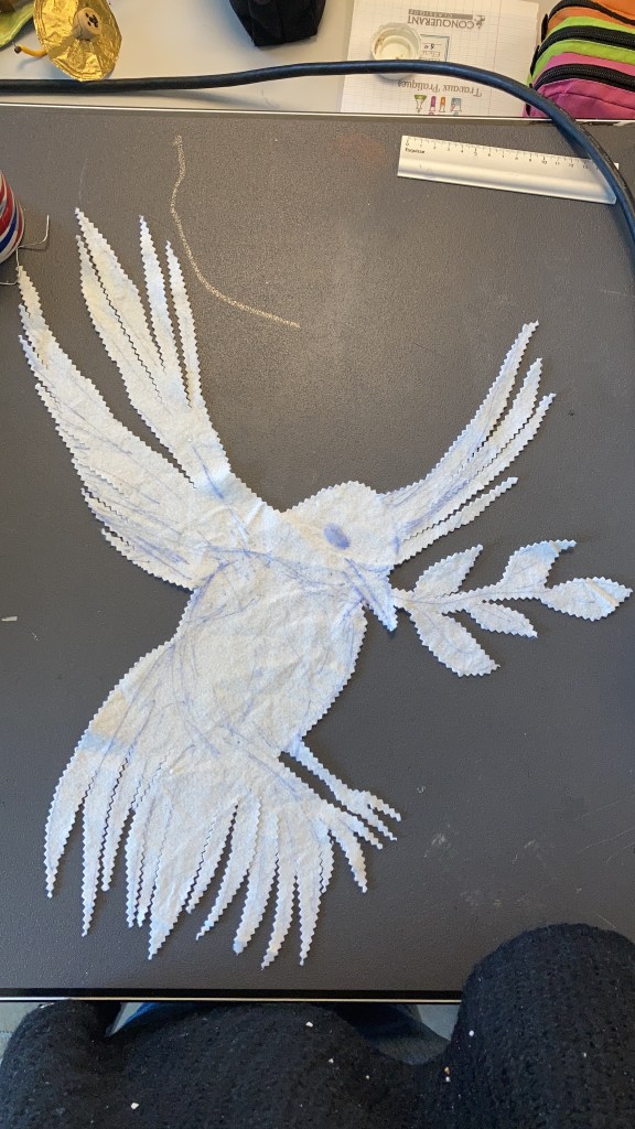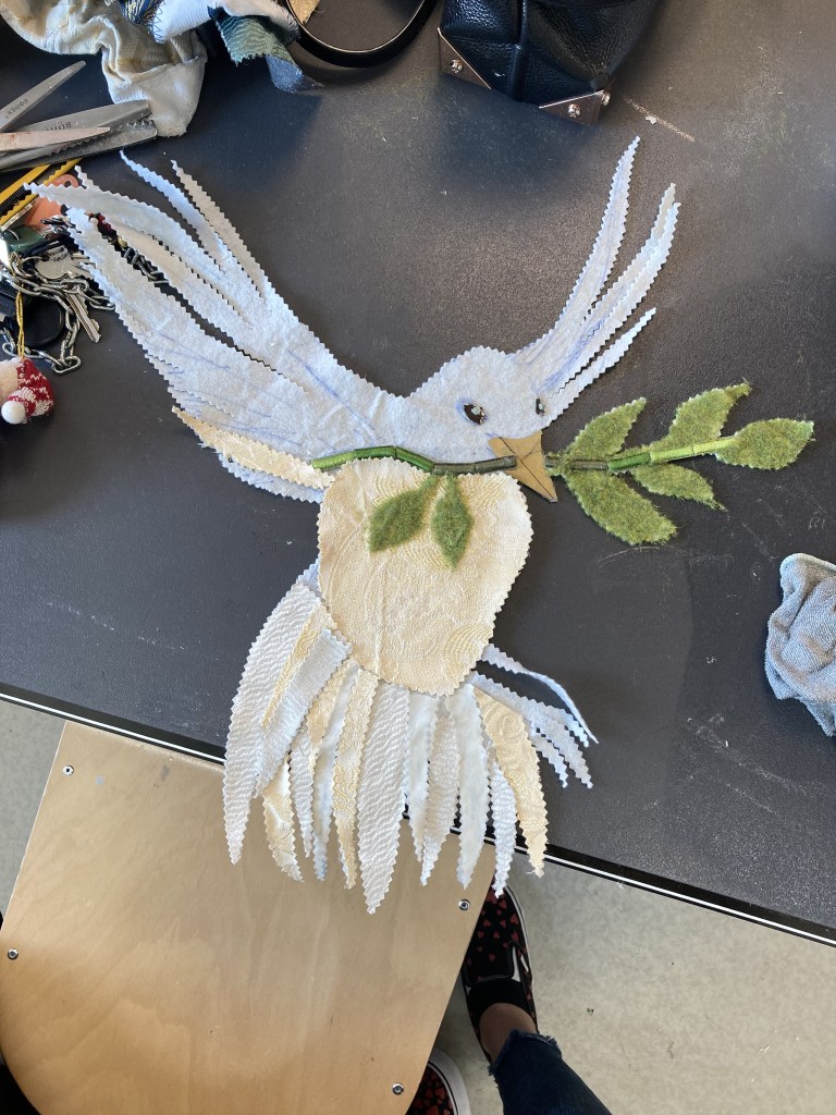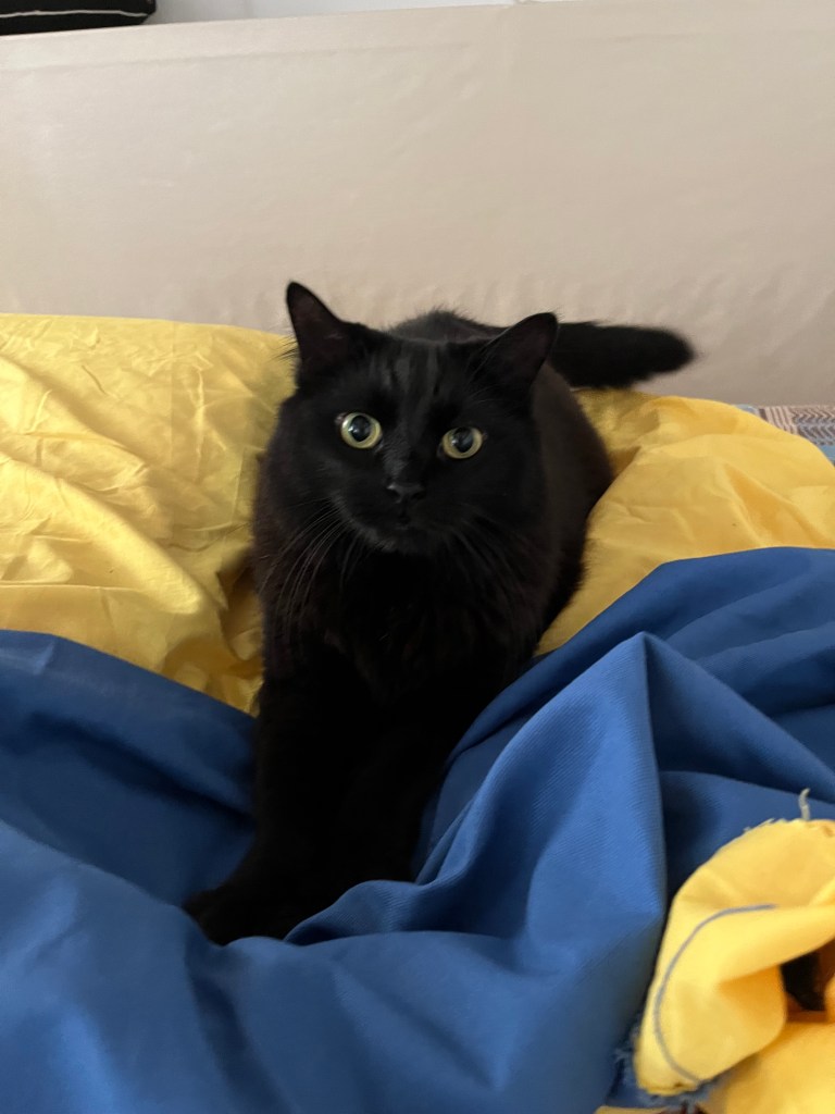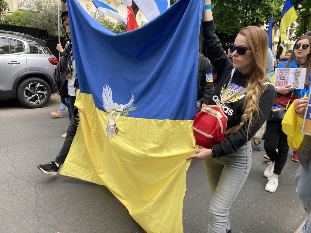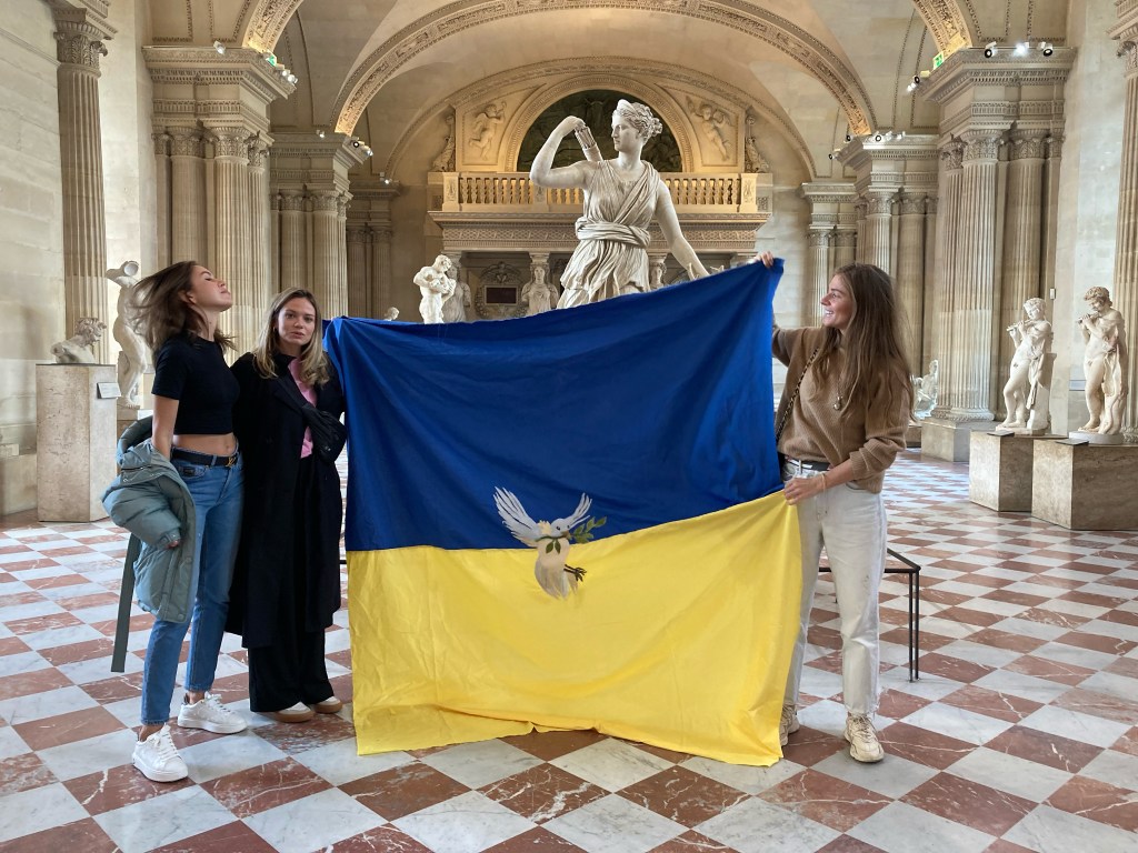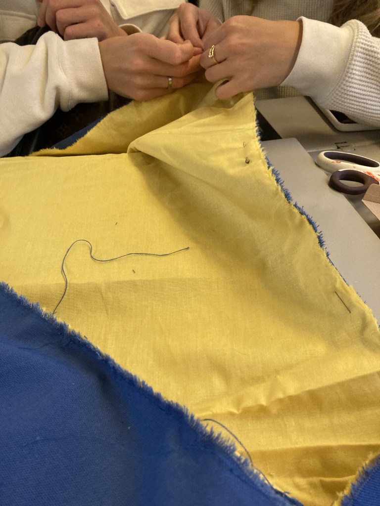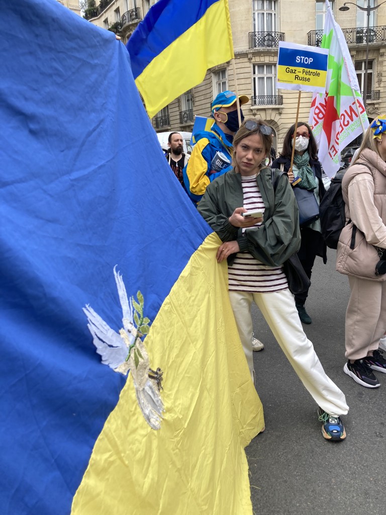 Ce drapeau a été cousu parfois avec les réfugiées accueillies par Magdala depuis mars 2022 et incarne l’espoir d’un arrêt de l’agression militaire russe en Ukraine, le retour de la paix sur le sol ukrainien et le droit, la liberté des peuples à décider de leur destin.